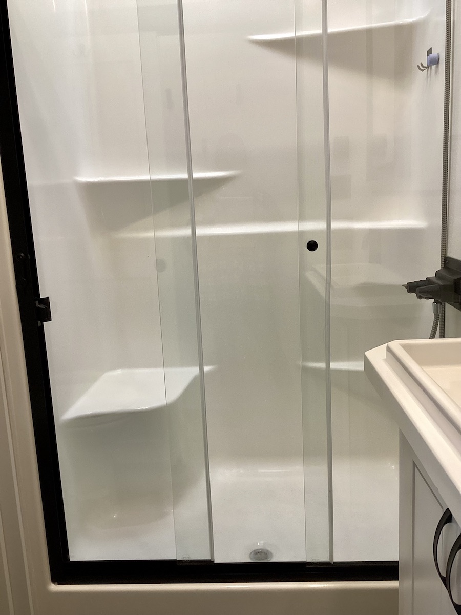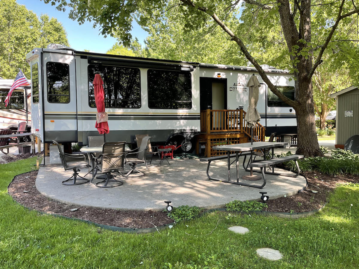 Shaded, paved lot with 2016 Jayco Pinnacle Model 36FBTS and 10’x12’ insulated and finished shed. The shed has bead board paneling, ceiling fan, tile floor, metal roof, A/C and heat. RV has 1.5 baths, king bed, dual sinks in master bath, electric fireplace,